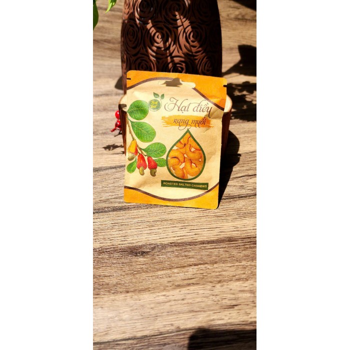 Hạt điều rang muối Hải Long Food được đóng gói trong túi Kraft nhỏ xinh, hình ảnh bắt mắt, rất tiện lợi khi sử dụng và mang đi.